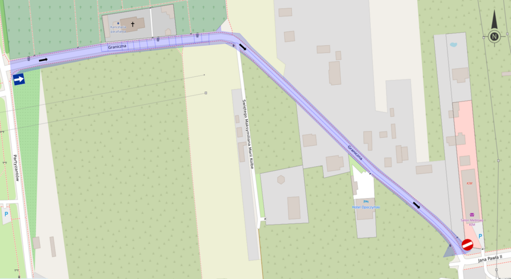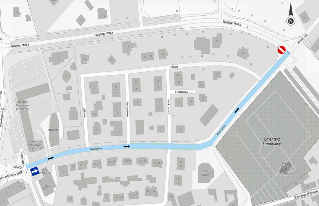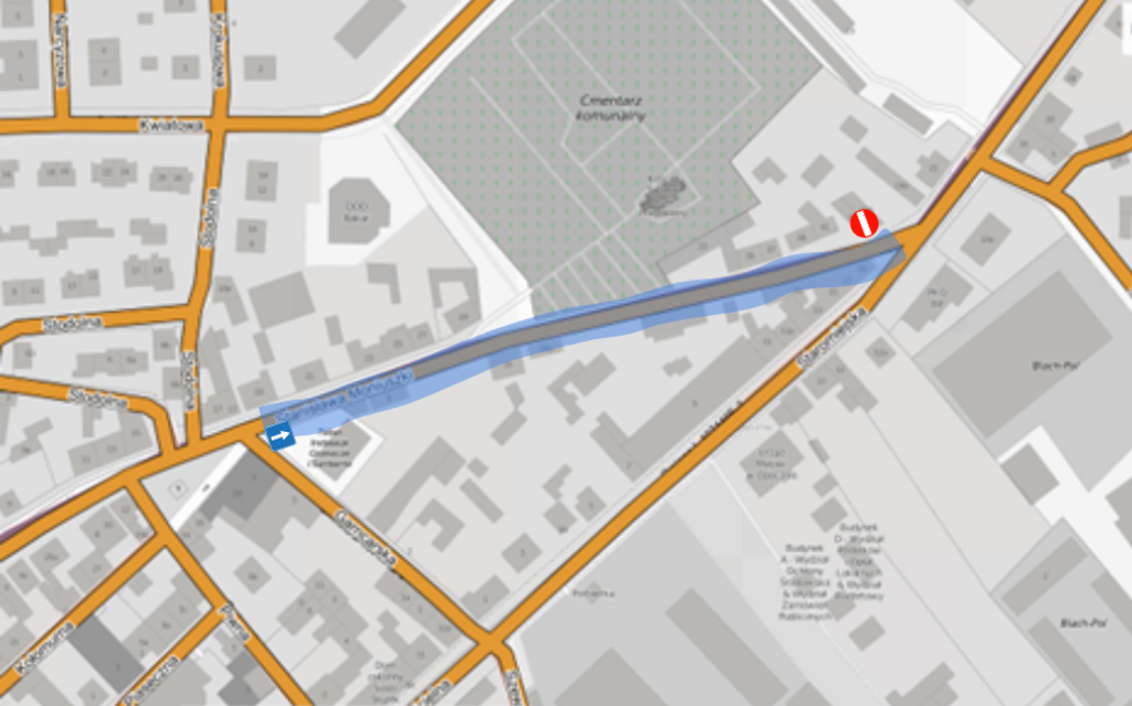 Na odcinku od skrzyżowania z ul. Partyzantów do skrzyżowania z ul. Jana Pawła II, stanowiącym dojazd do cmentarza grzebalnego, wprowadzona zostanie jednokierunkowa organizacja ruchu w kierunku od ul. Partyzantów do ul. Jana Pawła II.