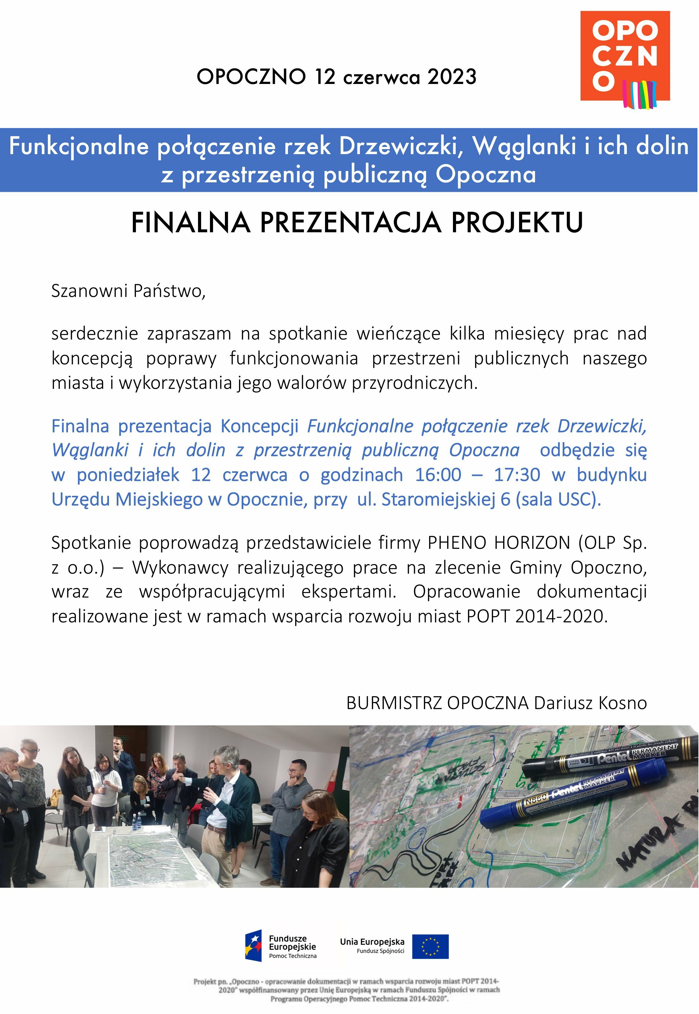 Finalna prezentacja Koncepcji Funkcjonalne połączenie rzek Drzewiczki, Wąglanki i ich dolin z przestrzenią publiczną Opoczna, odbędzie się w poniedziałek 12 czerwca 2023 r. od godz. 16:00 do 17:30 w budynku Urzędu Miejskiego w Opocznie, przy ul. Staromiejskiej 6 w Sali Urzędu Stanu Cywilnego (sala USC).