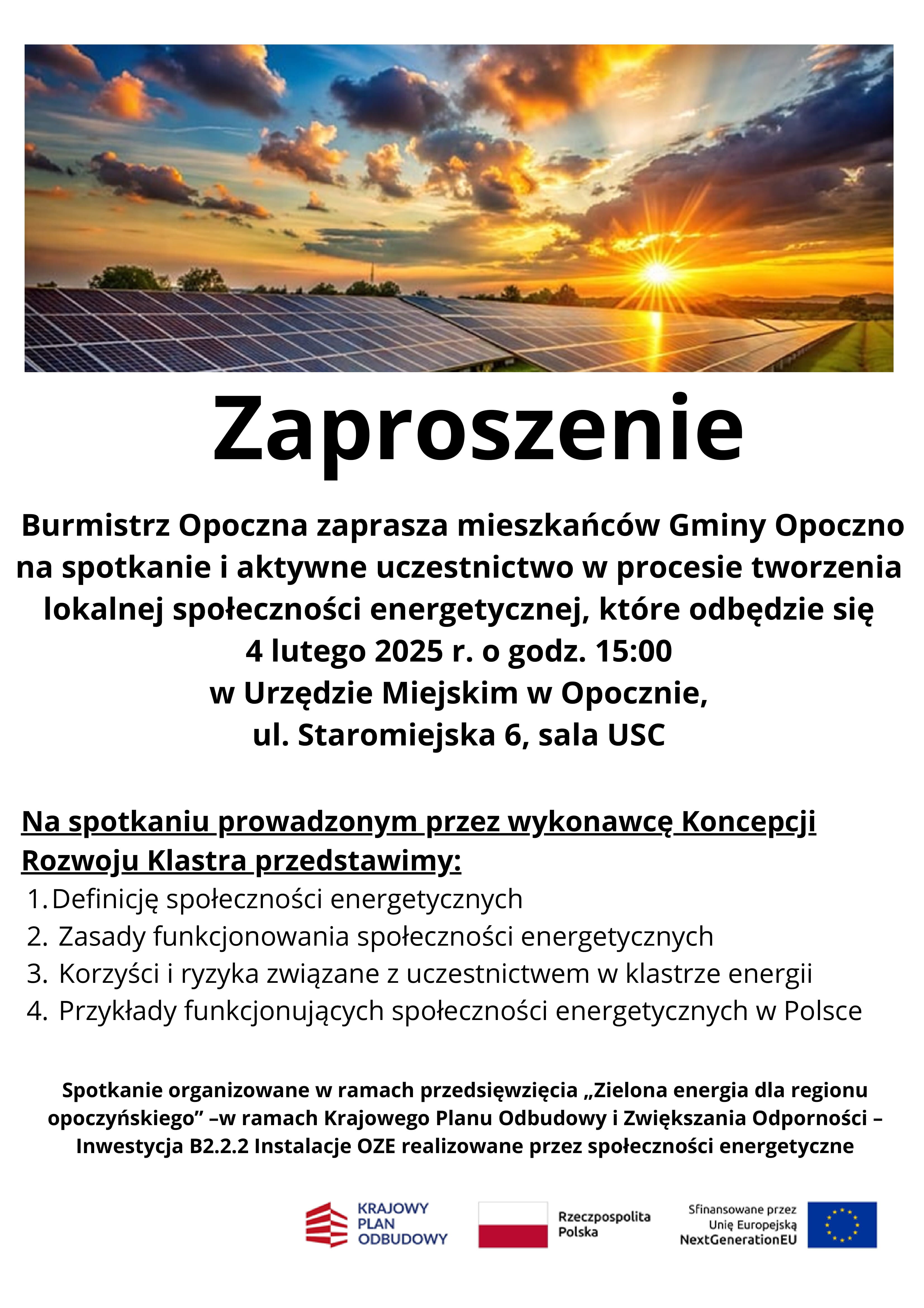 Spotkanie organizowane w ramach przedsięwzięcia „Zielona energia dla regionu opoczyńskiego" - w ramach Krajowego Planu Odbudowy i Zwiększania Odporności -Inwestycja 82.2.2 Instalacje OZE realizowane przez społeczności energetyczne.