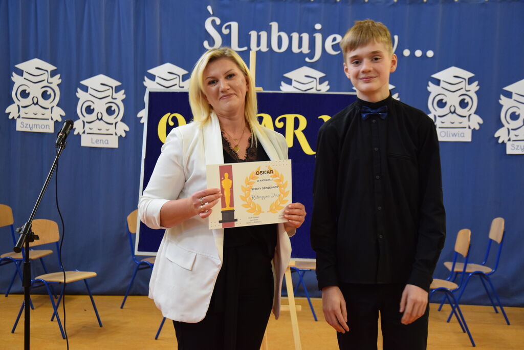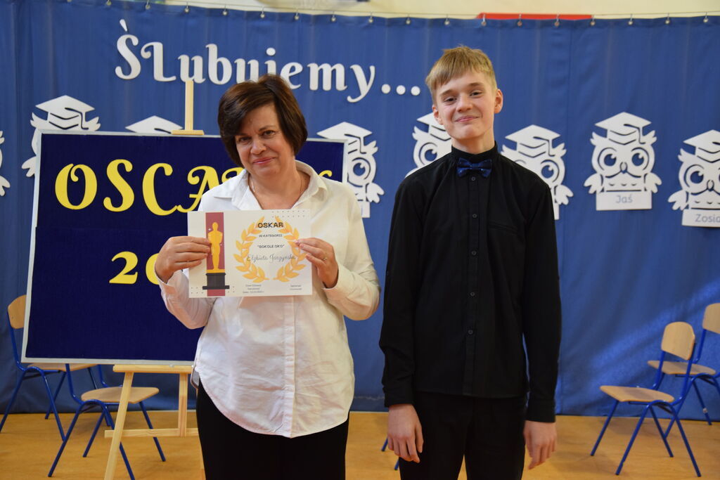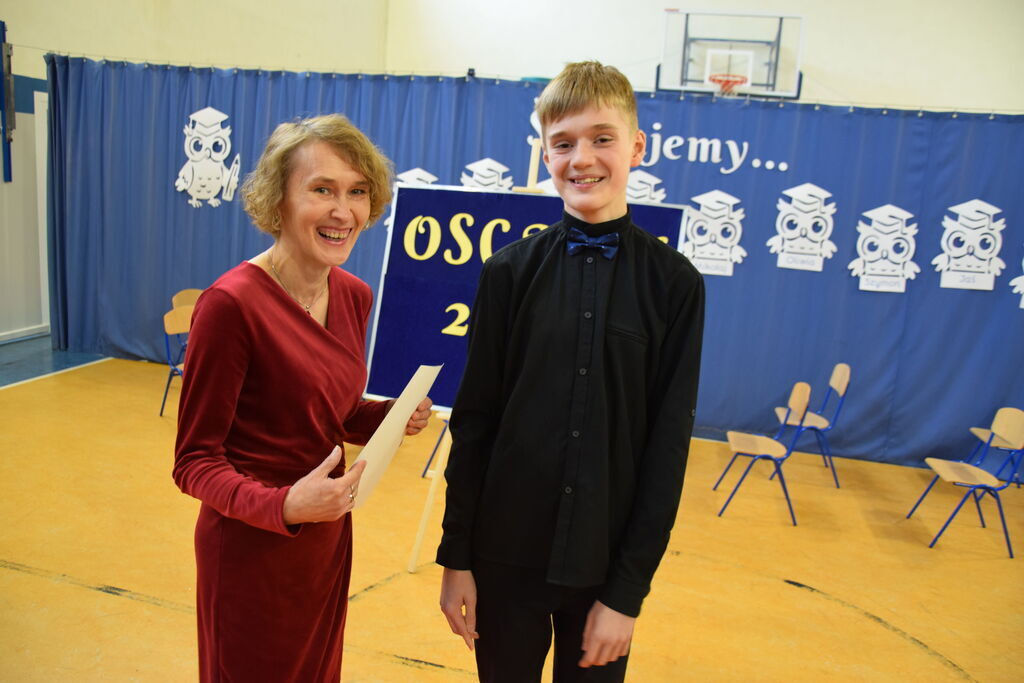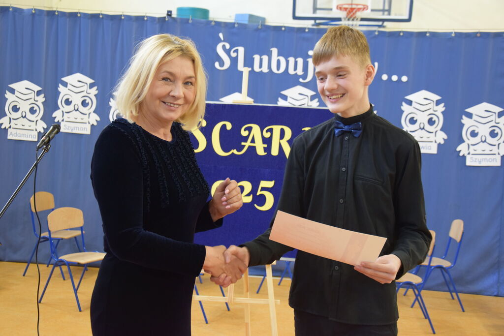 Pasowanie stało się także okazją do sympatycznego gestu ze strony uczniów starszych klas, którzy – w żartobliwy, ale pełen serdeczności sposób – wyróżnili swoich nauczycieli, wręczając im pamiątkowe dyplomy uznania.