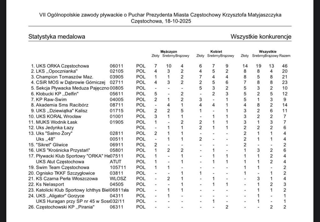 18 października 2025 roku w Częstochowie odbyły się VII Ogólnopolskie Zawody Pływackie o Puchar Prezydenta Miasta Częstochowy Krzysztofa Matyjaszczyka. To był prawdziwy sprawdzian formy na krótkim basenie (25 m) i zawodnicy Opocznianki zdali go celująco. W zawodach wzięło udział 391 pływaków z 30 klubów z całej Polski. sekcję pływacką LKS Opocznianki reprezentowało 38 zawodników, którzy zaprezentowali się znakomicie, ustanawiając aż 65 nowych rekordów życiowych na 76 startów indywidualnych.