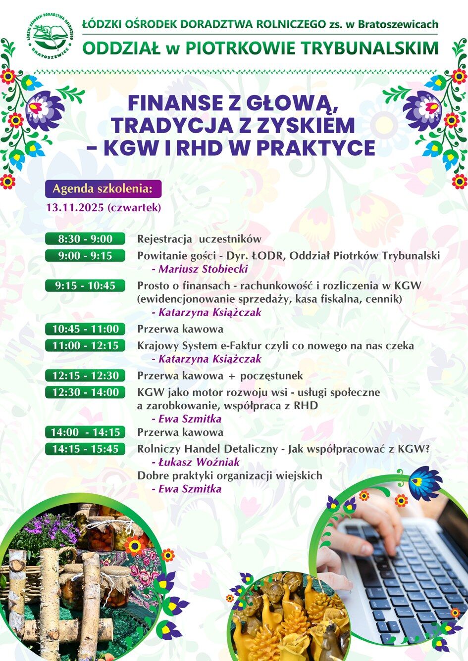 Spotkanie skierowane jest do członków Kół Gospodyń Wiejskich oraz osób prowadzących lub planujących rozpoczęcie Rolniczego Handlu Detalicznego (RHD). Podczas szkolenia omówione zostaną najważniejsze zagadnienia związane z finansowaniem, prowadzeniem działalności oraz promocją lokalnych produktów.