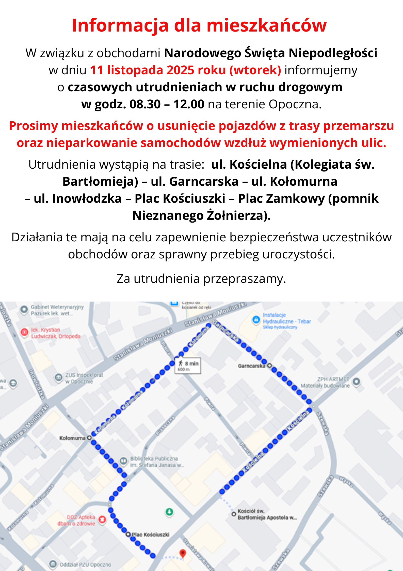 Prosimy mieszkańców o usunięcie pojazdów z trasy przemarszu oraz nieparkowanie samochodów wzdłuż wymienionych ulic.