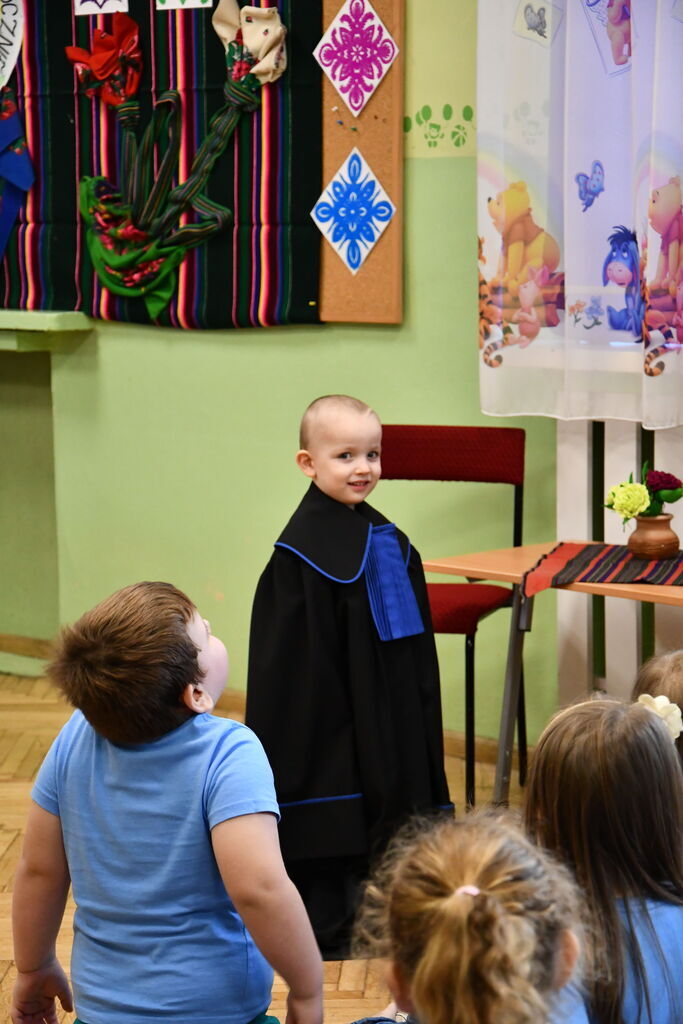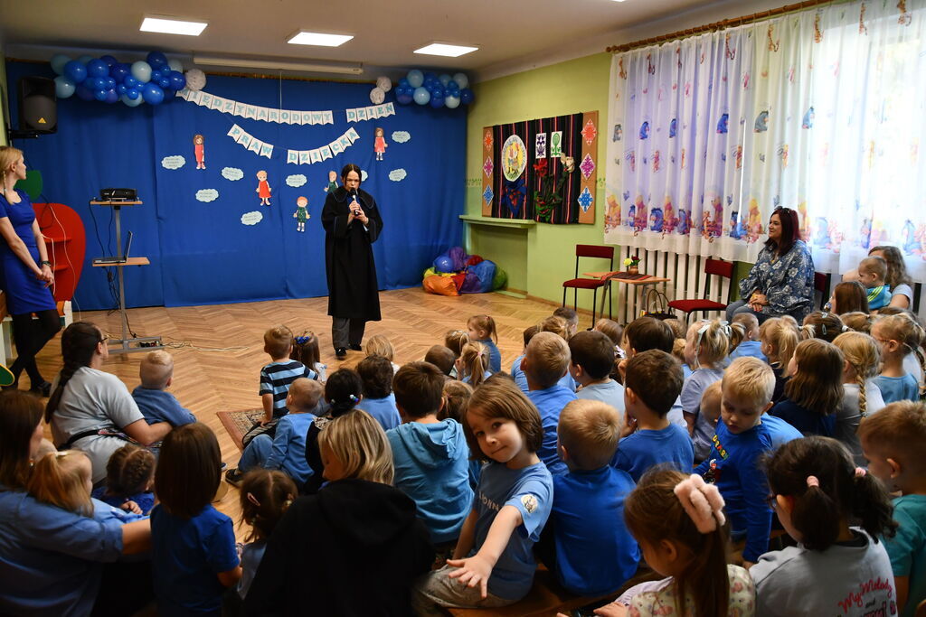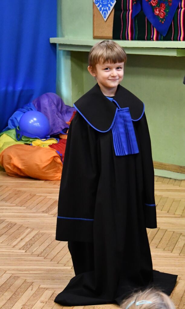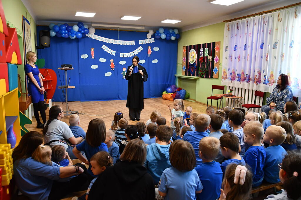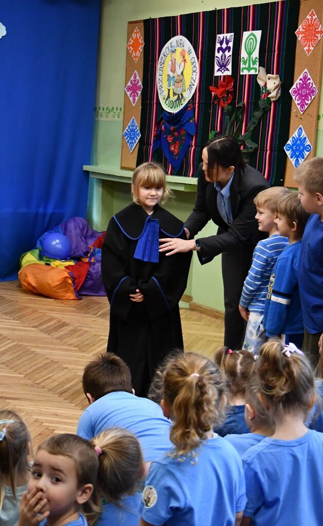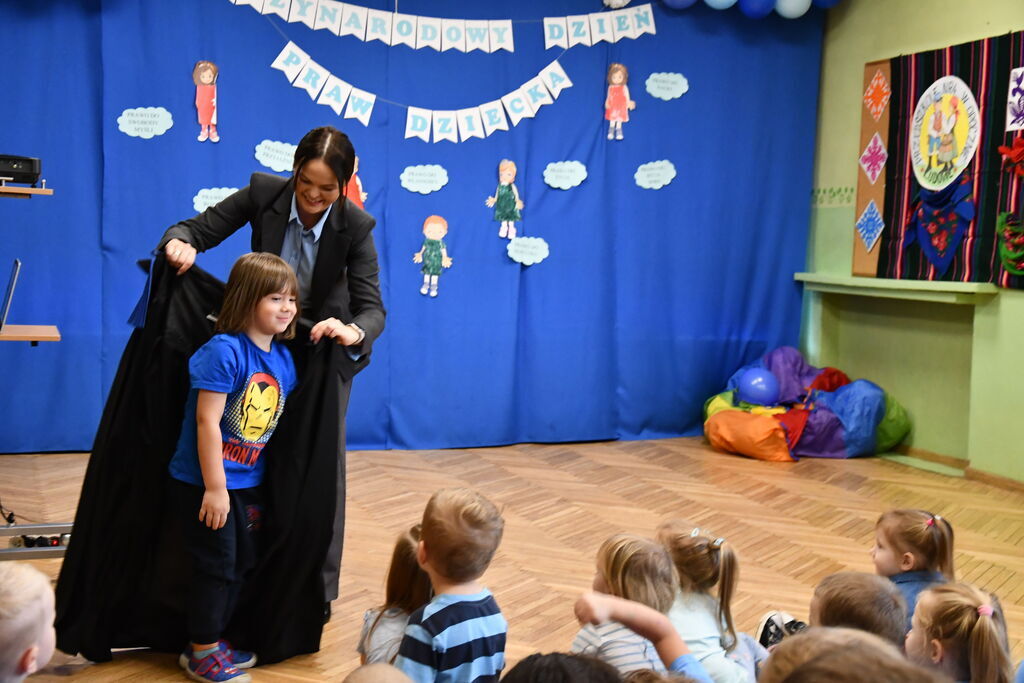 Mecenas Sylwia Stępień-Adamczyk opowiedziała dzieciom o swojej pracy radcy prawnego oraz o zawodach związanych z wymiarem sprawiedliwości. Wyjaśniła, jak wyglądają togi prawników i sędziów. Dużym przeżyciem dla dzieci była możliwość obejrzenia z bliska togi radcy prawnego. Mecenas zaprezentowała jej elementy, a następnie pozwoliła dzieciom przymierzyć strój, co wywołało ogromną ciekawość i entuzjazm.