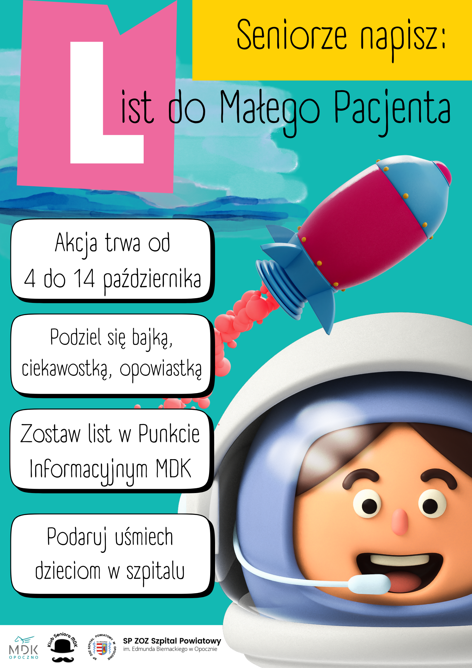 Na czym polega akcja? Od 4 do 14 października seniorzy z Klubu Seniora mogą napisać list adresowany do dzieci z Oddziału Dziecięcego Szpitala Powiatowego im. E. Biernackiego w Opocznie. W korespondencji do małego pacjenta mogą znaleźć się listy z bajkami, ciekawymi opowiastkami, anegdotami. Mile widziane jest również ozdobienie listów rysunkami, wycinankami, malowankami - tak by były one jak najbardziej barwne i kolorowe.