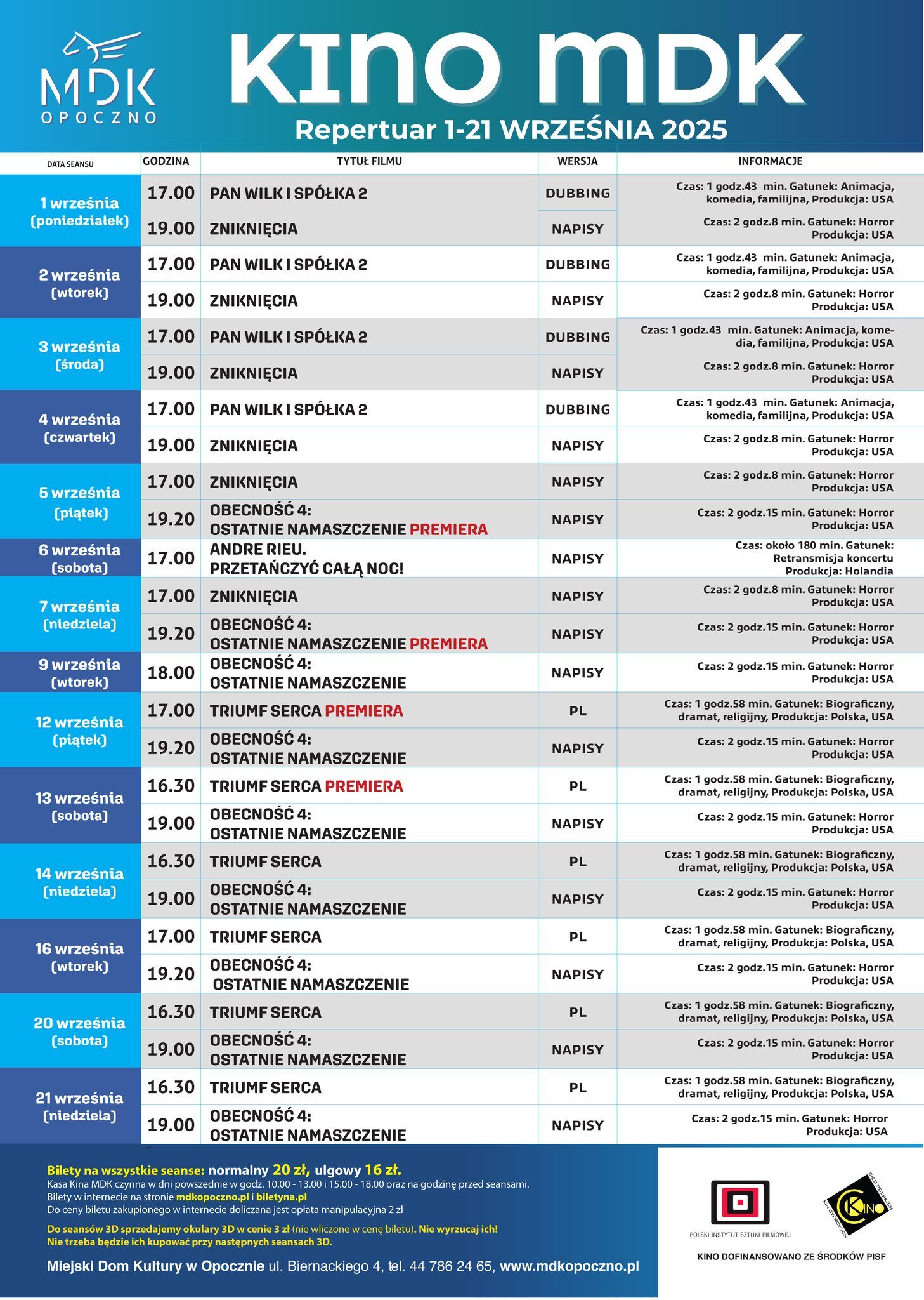 Bilety na wszystkie seanse: normalny 20 zł, ulgowy 16 zł. Kasa KINA MDK czynna w dni powszednie w godz. 10.00-13.00 i 15.00-18.00 oraz na godzinę przed seansami. Bilety w Internecie na stronie: www.mdkopoczno.pl i www.biletyna.pl Do ceny zakupionego w Internecie doliczana jest opłata manipulacyjna 2 zł.