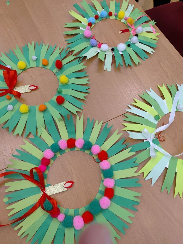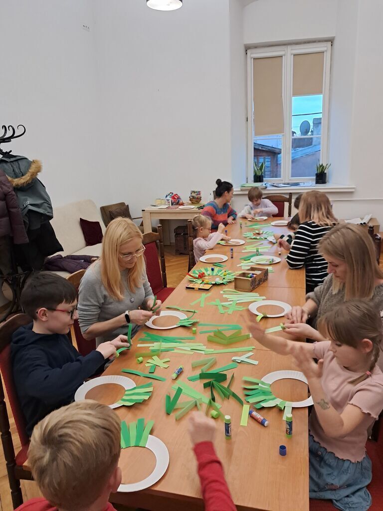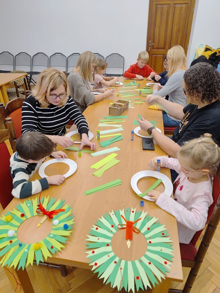 Przy wspólnych stołach panował twórczy gwar – dzieci z entuzjazmem wybierały dekoracje, a dorośli pomagali przy sklejaniu elementów i nadawaniu kształtu papierowym dziełom. Choć każdy wieniec był wykonany z podobnych materiałów, wszystkie różniły się pomysłowością i charakterem, od razu wprowadzając w świąteczny nastrój.