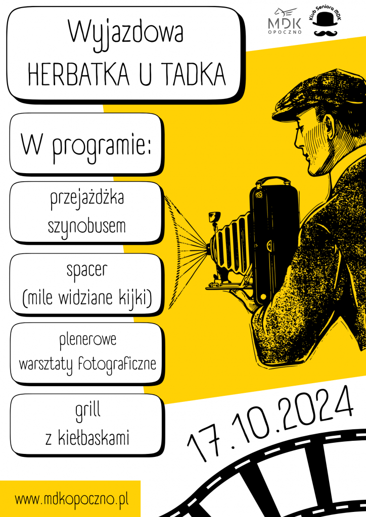 Uwaga: ilość miejsc ograniczona (pierwszeństwo w zapisach mają Klubowicze uczestniczący na spotkaniu Klubu Seniora w dniu 3 października, kiedy to miała miejsce prelekcja Pana Przemysława na temat fotografii). Zapisy odbywają się telefonicznie pod numerem tel. 601 074 810.