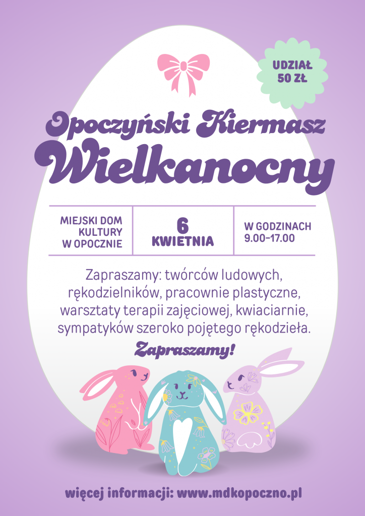 Udział w kiermaszu jest odpłatny i wynosi 50 zł od stoiska. Opłatę można uiścić osobiście w kasie MDK od poniedziałku do piątku w godzinach od 8.00 do 19.30 lub przelewem na konto MDK Opoczno nr 63 8992 0000 0033 1957 2000 0010 do dnia 3 kwietnia br. z dopiskiem „Opoczyński Kiermasz Wielkanocny”.