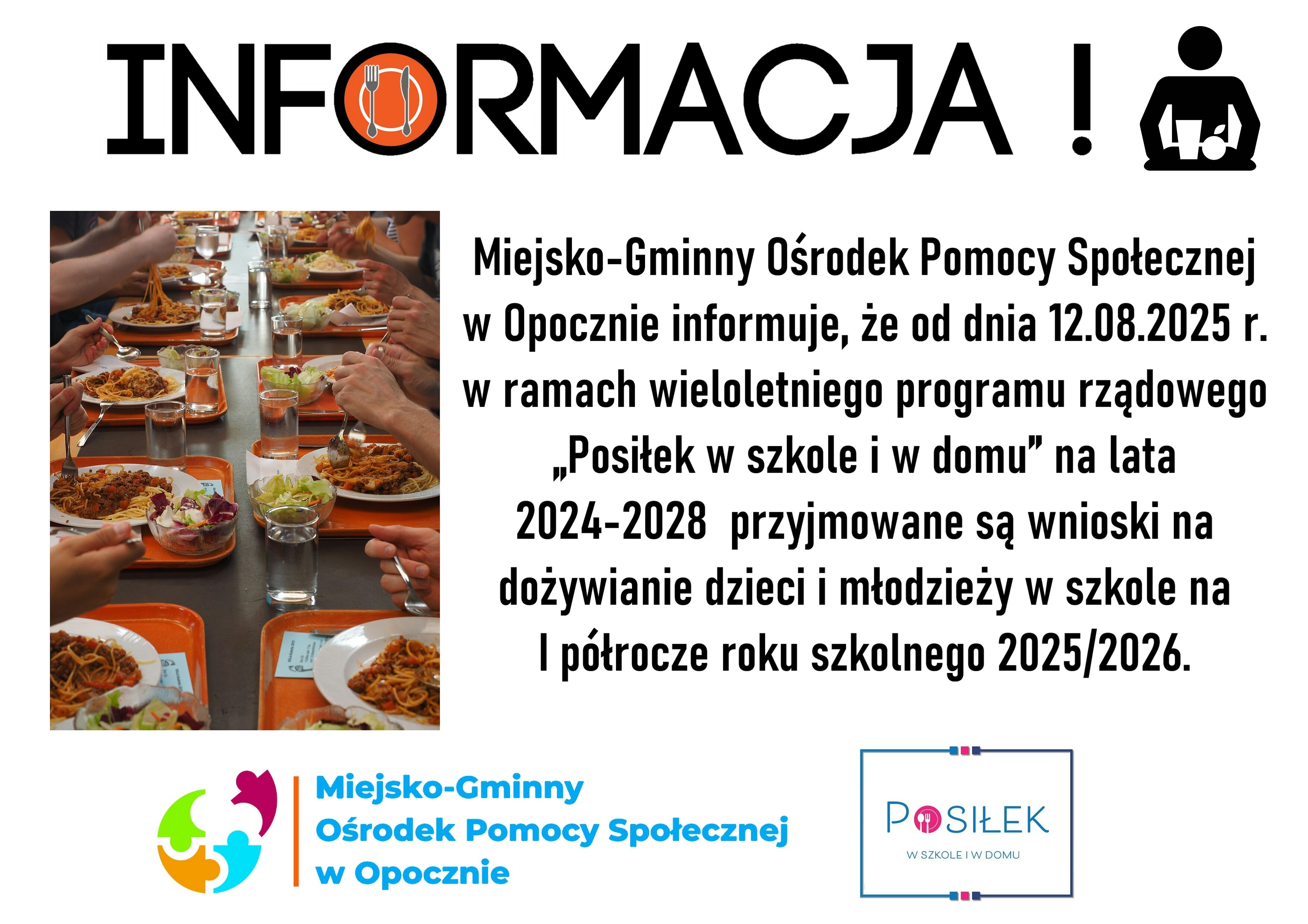 Miejsko-Gminny Ośrodek Pomocy Społecznej w Opocznie informuje, że od dnia 12.08.2025 r. w ramach wieloletniego programu rządowego „Posiłek w szkole i w domu" na lata 2024-2028 przyjmowane są wnioski na dożywianie dzieci i młodzieży w szkole na I półrocze roku szkolnego 2025/2026.